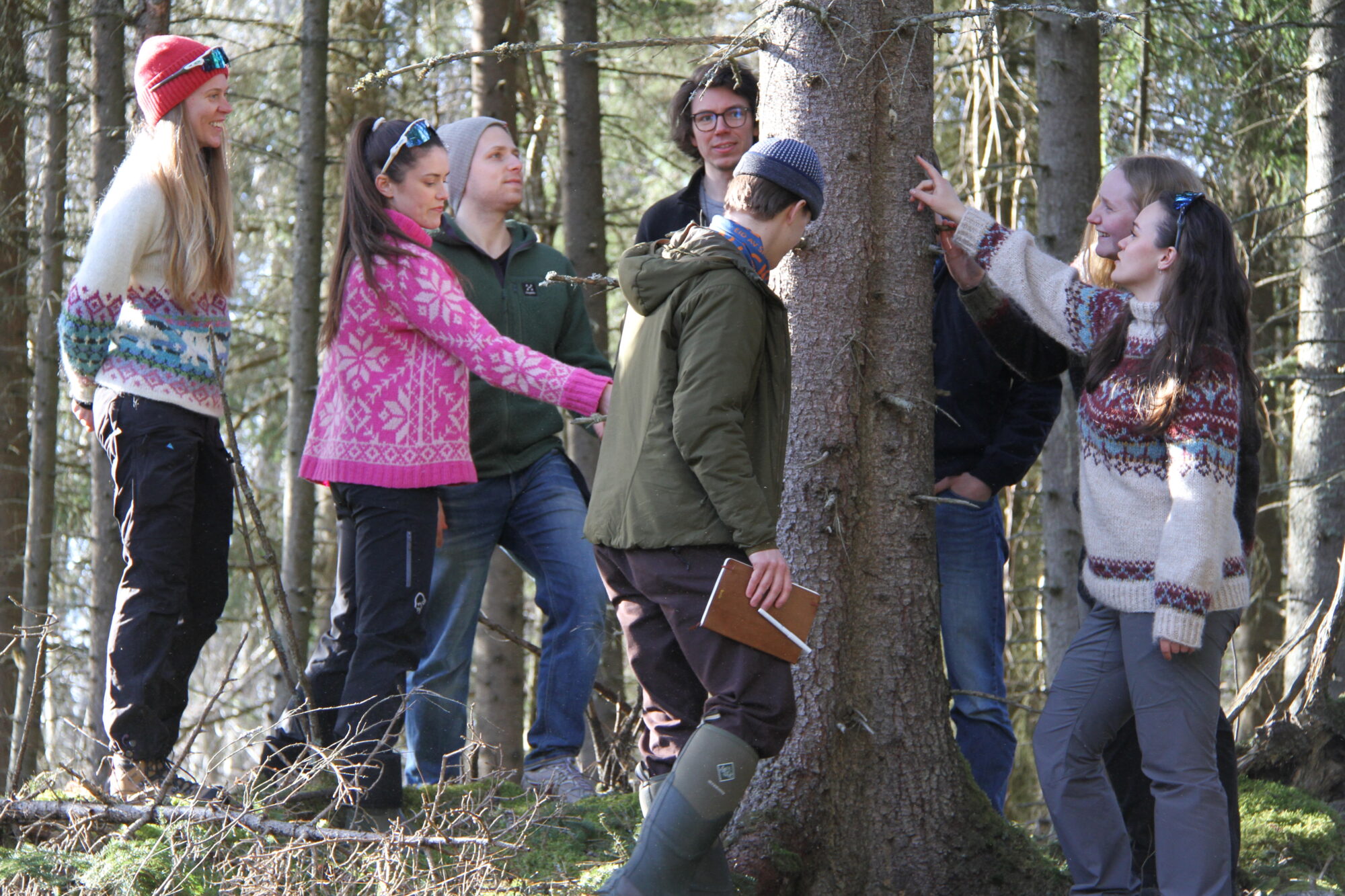Studenter på praksisøvelse i skogen.